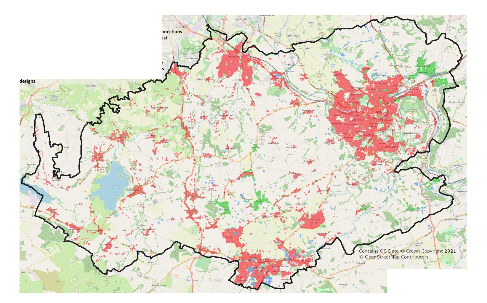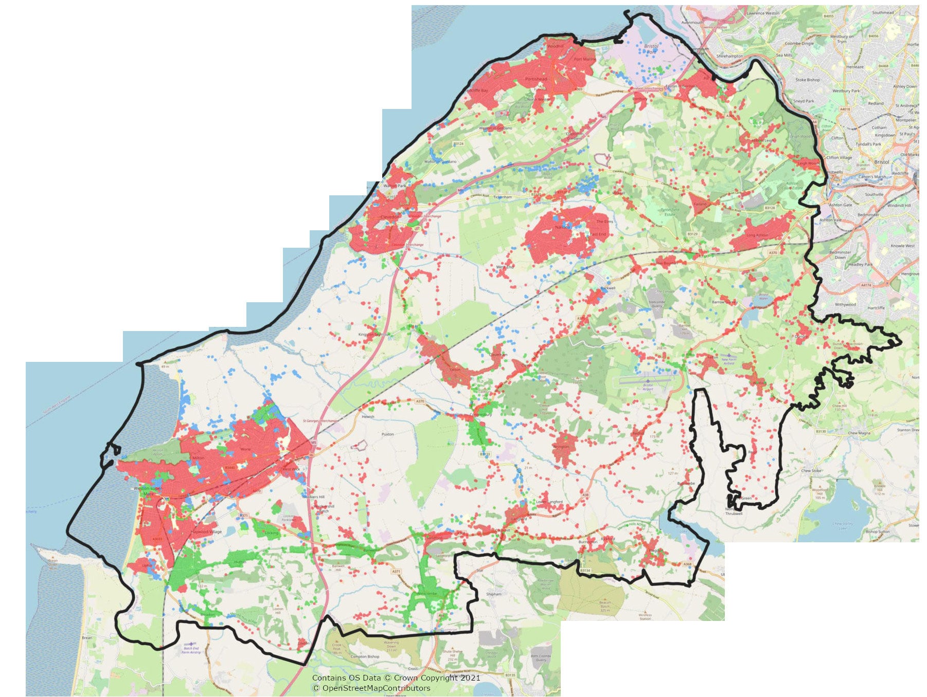 These maps show existing and planned broadband coverage for the area. Existing coverage comprises commercially-funded networks, coloured red, and CDS-funded networks, coloured green. The commercial coverage is based on returns from private sector broadband providers.